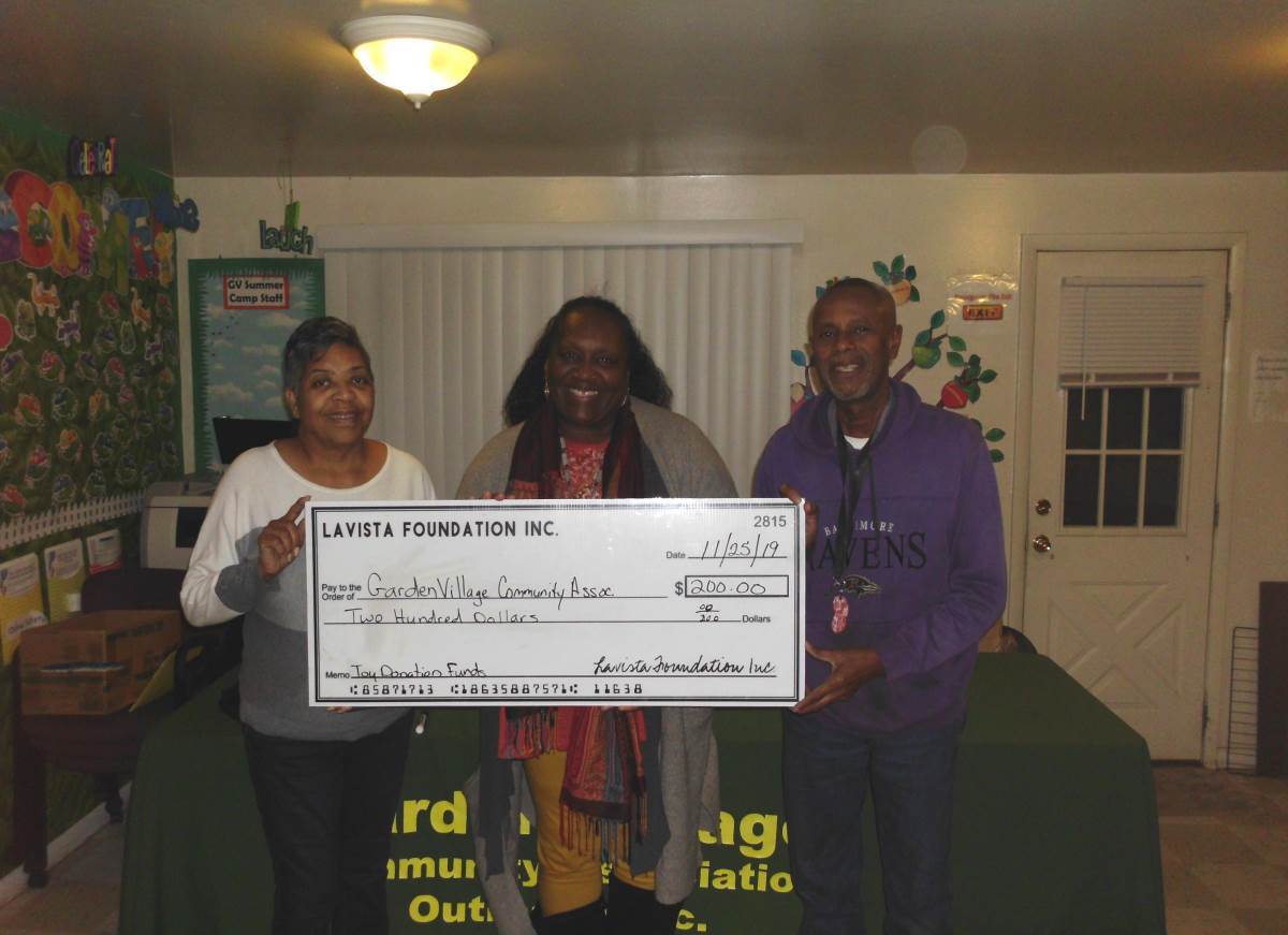Lavista member Pete Moody presenting check to theGardenvillage Community Association for the their 2019 children's Toy Drive (ABOVE)